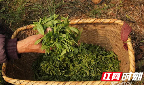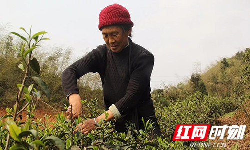 鳌头村周上组53岁的周开桂和老伴吴阳秀是塔山瑶族乡建档立卡贫困户,他将土地流转给“塔山农贸”,负责管理茶园、鲜茶采摘、茶叶加工,一年下来既能拿土地租金,又有务工费。“一年能赚1万多哩”,周开桂掰着手指头算着账,脸上笑开了花。